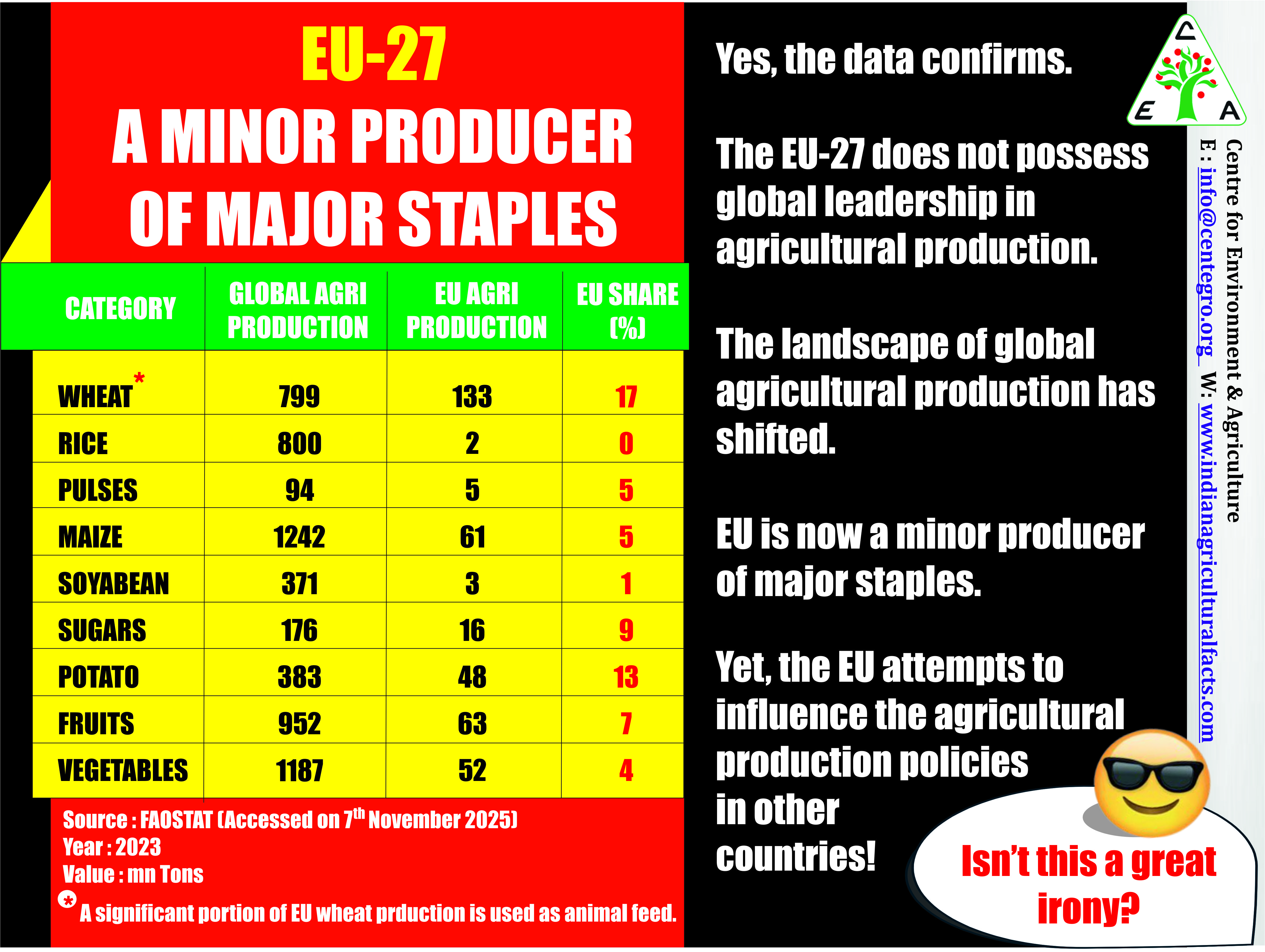 EU-27. A minor producer of major staples by CENTEGRO | Dec 3, 2025 Do we need to get influenced by EU agricultural production policies? NO. Facts here 👇 Submit a Comment Cancel replyYour email address will not be published. Required fields are marked *Comment * Name * Email * Website Save my name, email, and website in this browser for the next time I comment. Δ